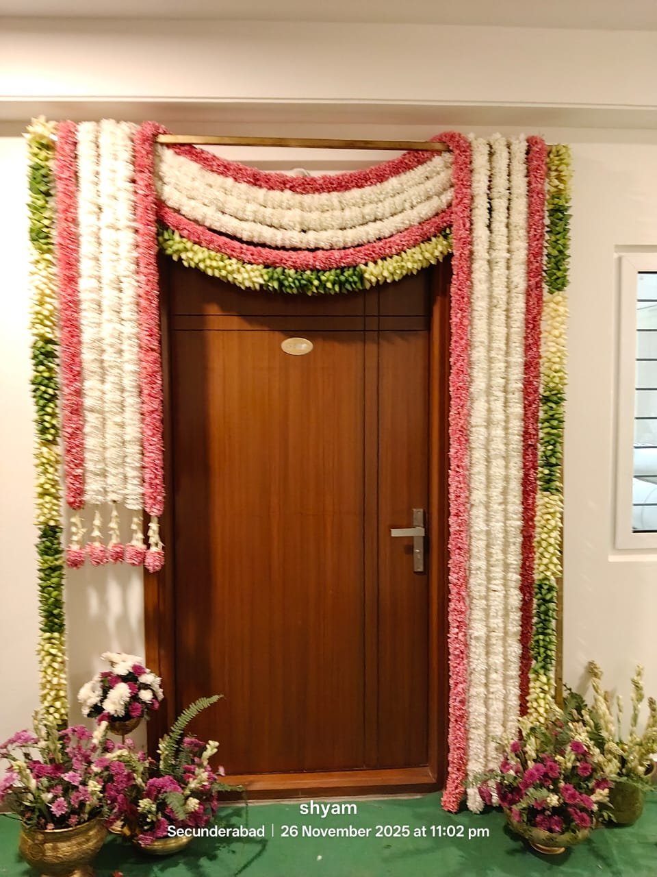 1 Main Door With Pink, White and light Green Full Natural Flower Hangings As Shown the Image