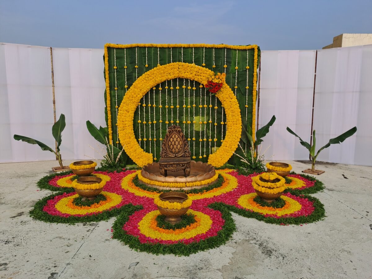 5 Gangalas and 1 Silver Peeta With Flower Rangoli Placed near to Backdrop as shown the image