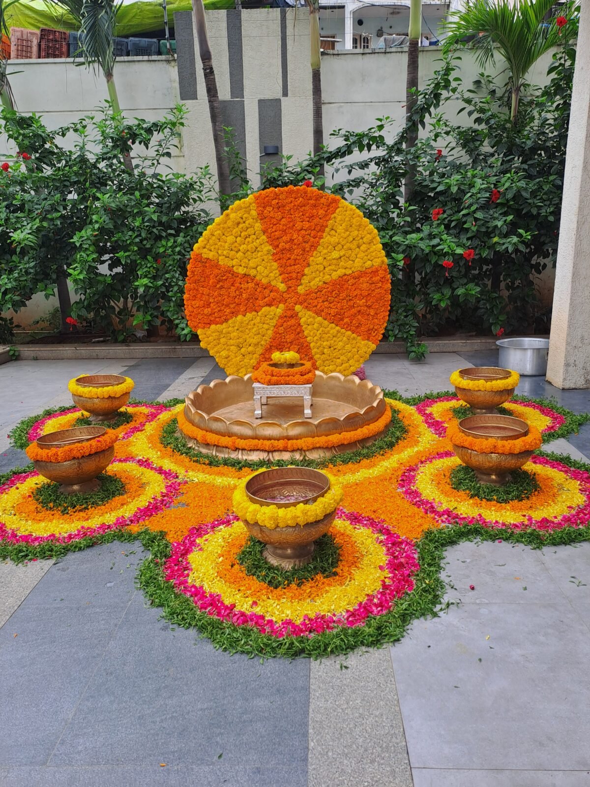 5 Gangalas and 1 Silver Peeta and Fiber Lotus Tub With Flower Rangoli Placed near to Backdrop as shown the image